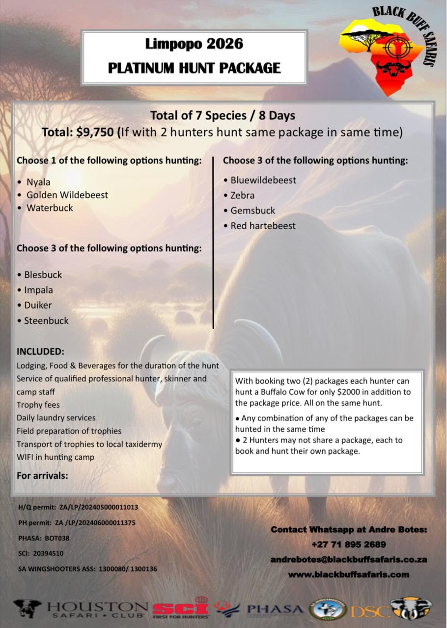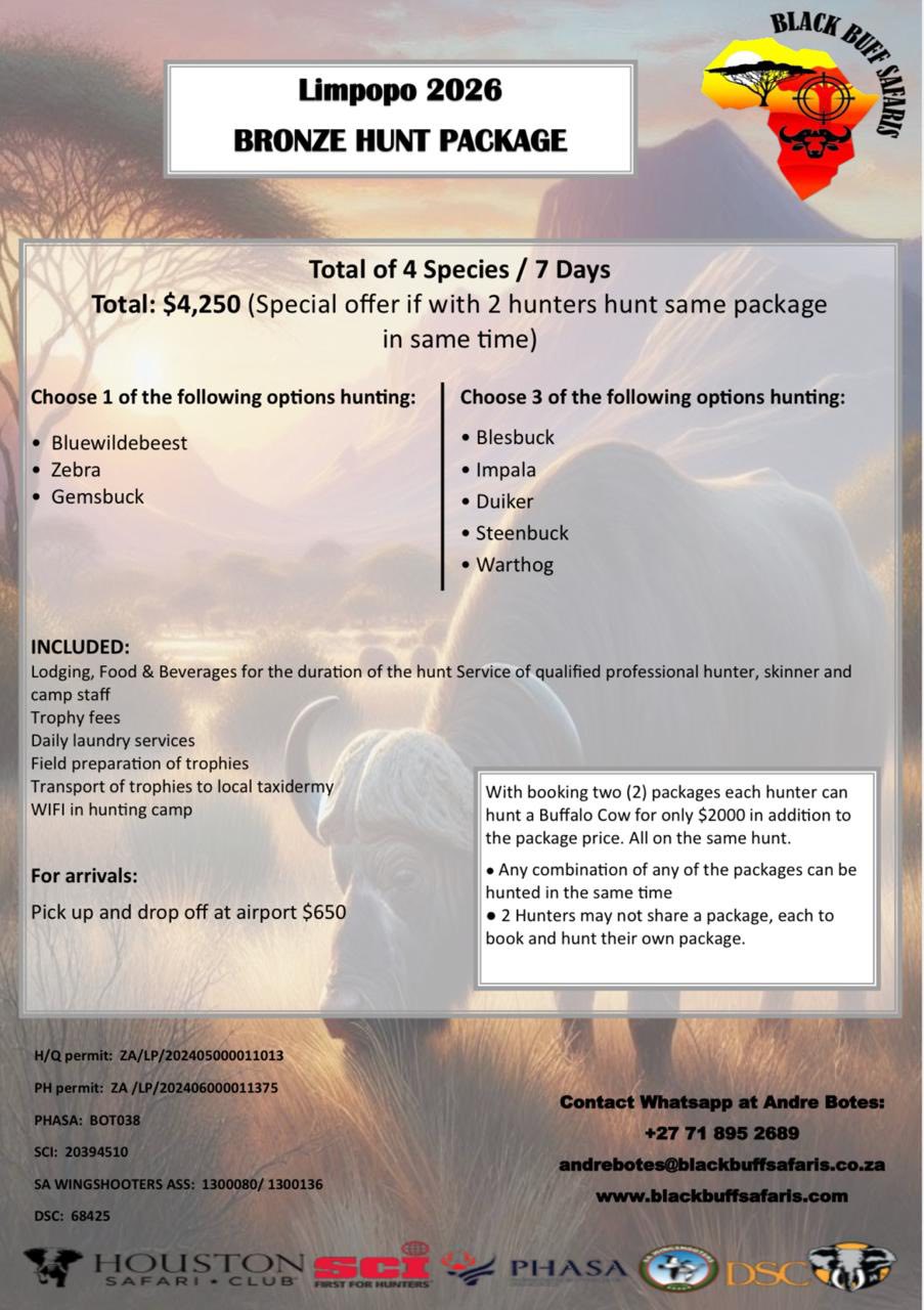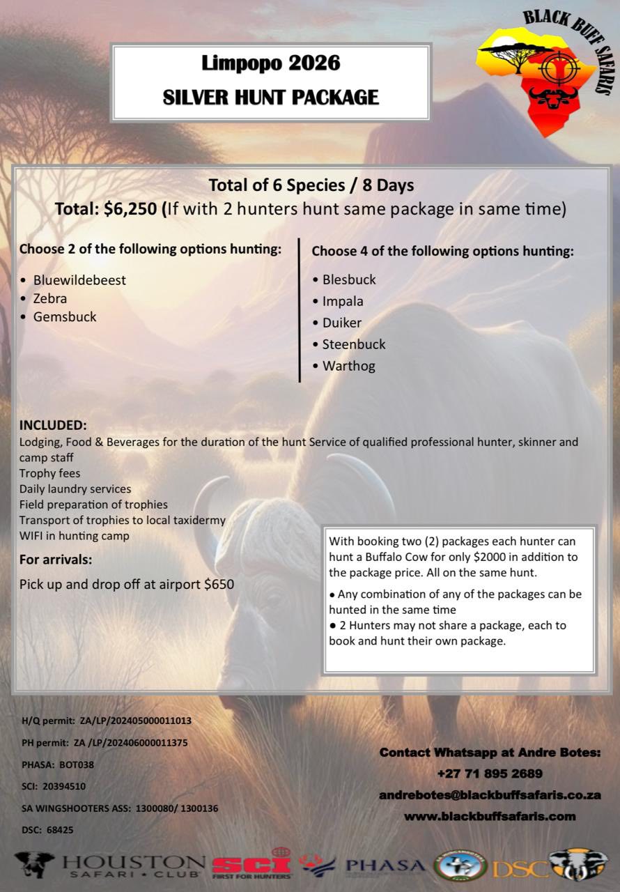 Black Buff Safaris is situated deep in the heart of the warm African bushveld in the Limpopo province of South Africa. Close to the small town of Alldays. With luxurious accommodation and hunting facilities, we cater for both rifle and bow hunting experiences.