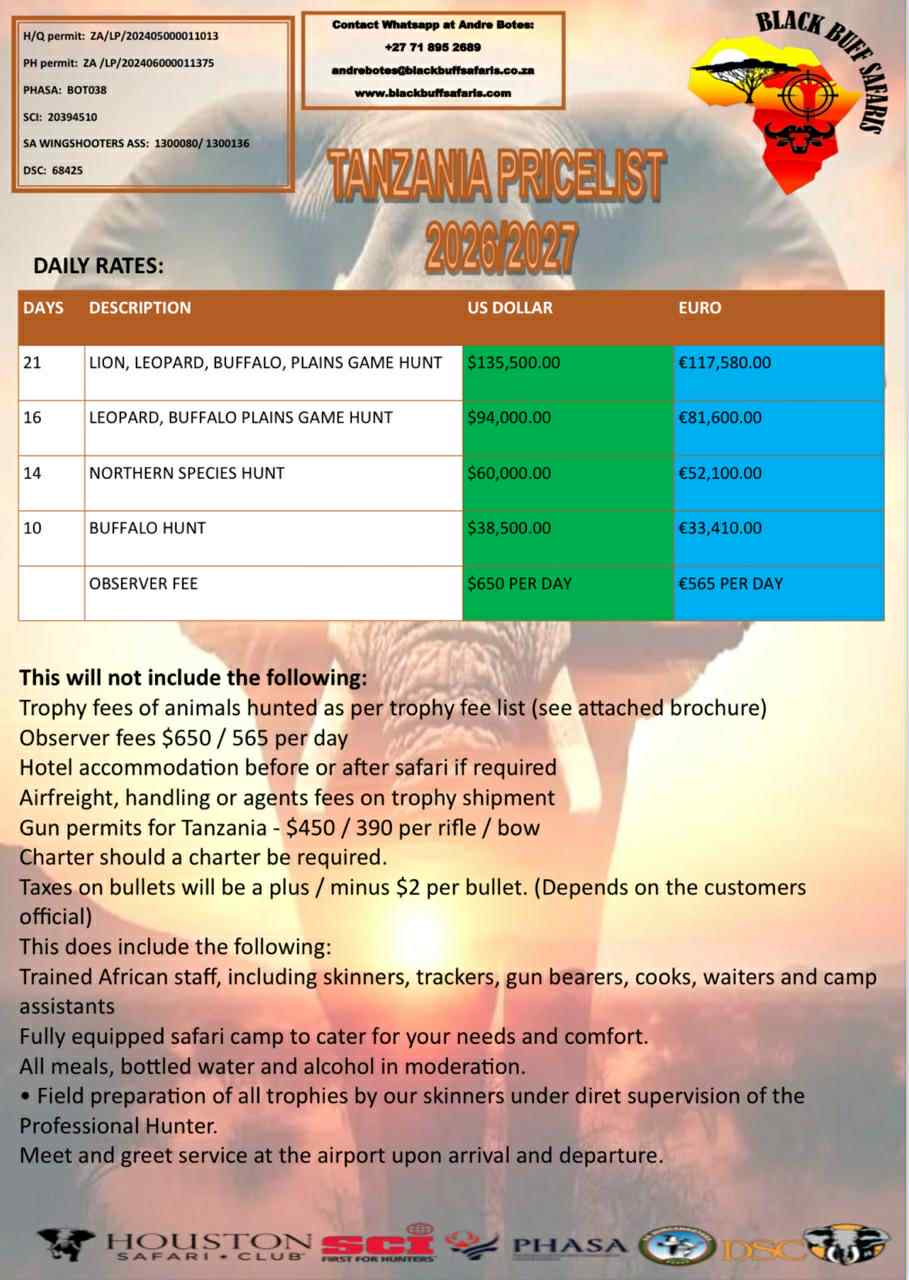 The hunting area covers 4000ha and we have concessions in other hunting areas as well. The climate in the area is very hot in the summer months and can reach temperatures of 42 degrees Celsius. In the winter months, it can be cold during the nights and early mornings with moderate warm temperatures during the day. We offer a wide range of species that can be hunted and more details can be obtained on request.